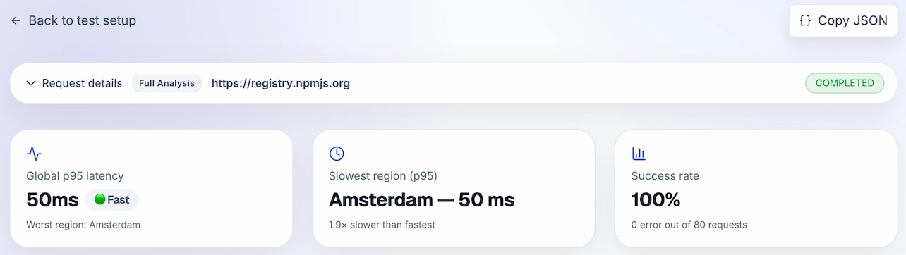 The npm registry is one of the most-used APIs on the internet and it responds in 22 ms globally. Run a free speed test on your own endpoint and see how you compare — no setup, no account required.
